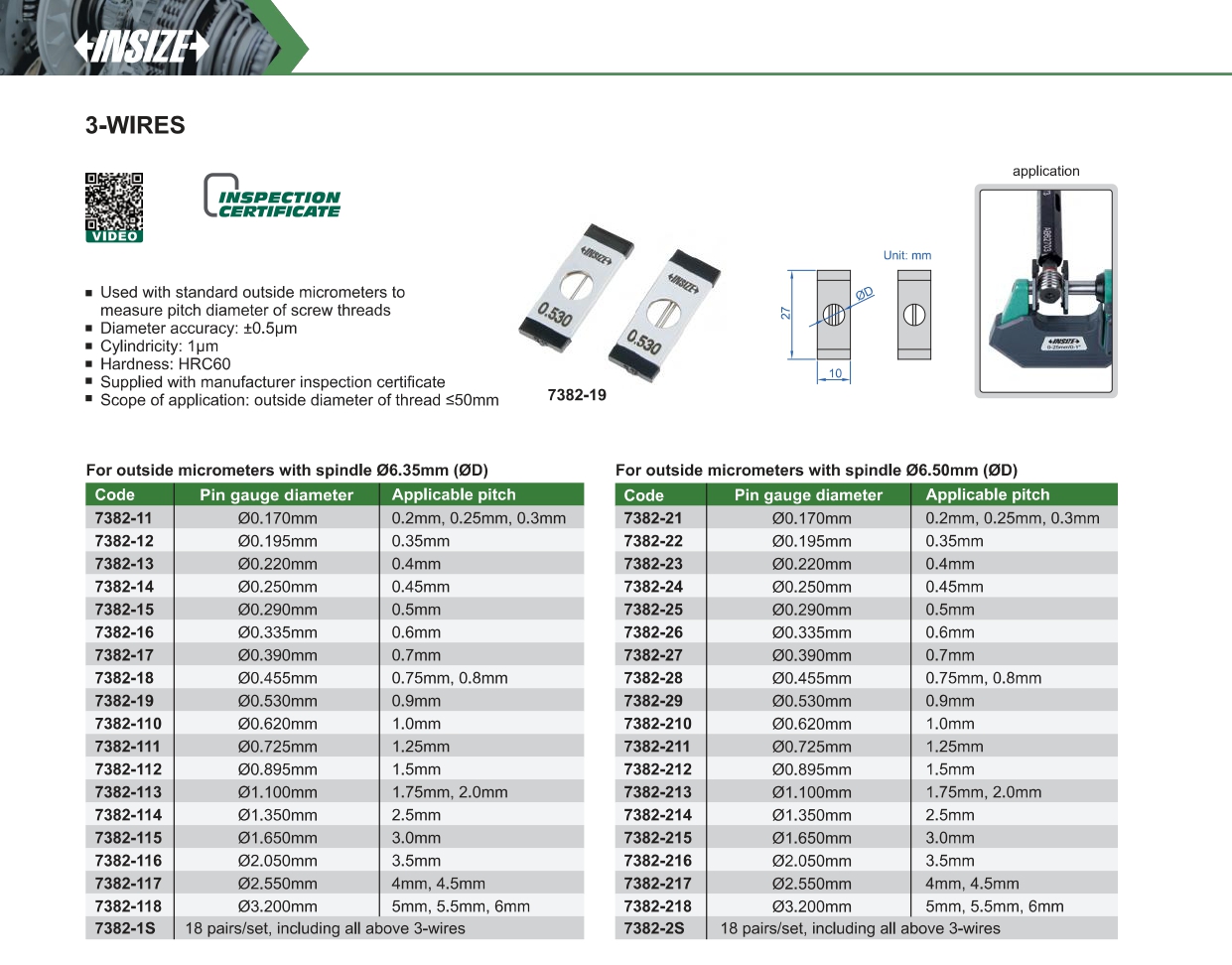 BỘ 3 DÂY ĐO REN INSIZE 7382 (±0.5µM, HRC60) – ĐO ĐƯỜNG KÍNH TRUNG BÌNH REN