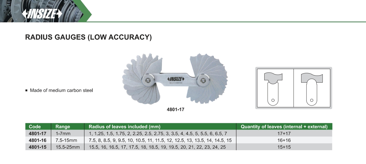 BỘ DƯỠNG ĐO BÁN KÍNH (GÓC BO R) INSIZE 4801 SERIES – CĂN LÁ THÉP CARBON ĐO CUNG LỒI VÀ LÕM