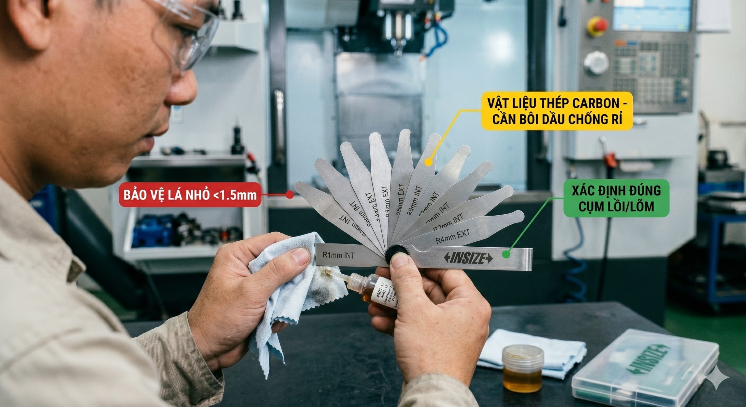 Thao tác: Sau khi hoàn tất thao tác đo góc lượn, cần dùng khăn sạch lau khô dung dịch làm mát (Coolant), phoi tiện hoặc mồ hôi tay bám trên thước đo cung lồi và cung lõm. Bắt buộc phải bôi một lớp dầu chống rỉ (Anti-rust oil) mỏng lên các bề mặt lá thép trước khi gập gọn cất vào hộp.