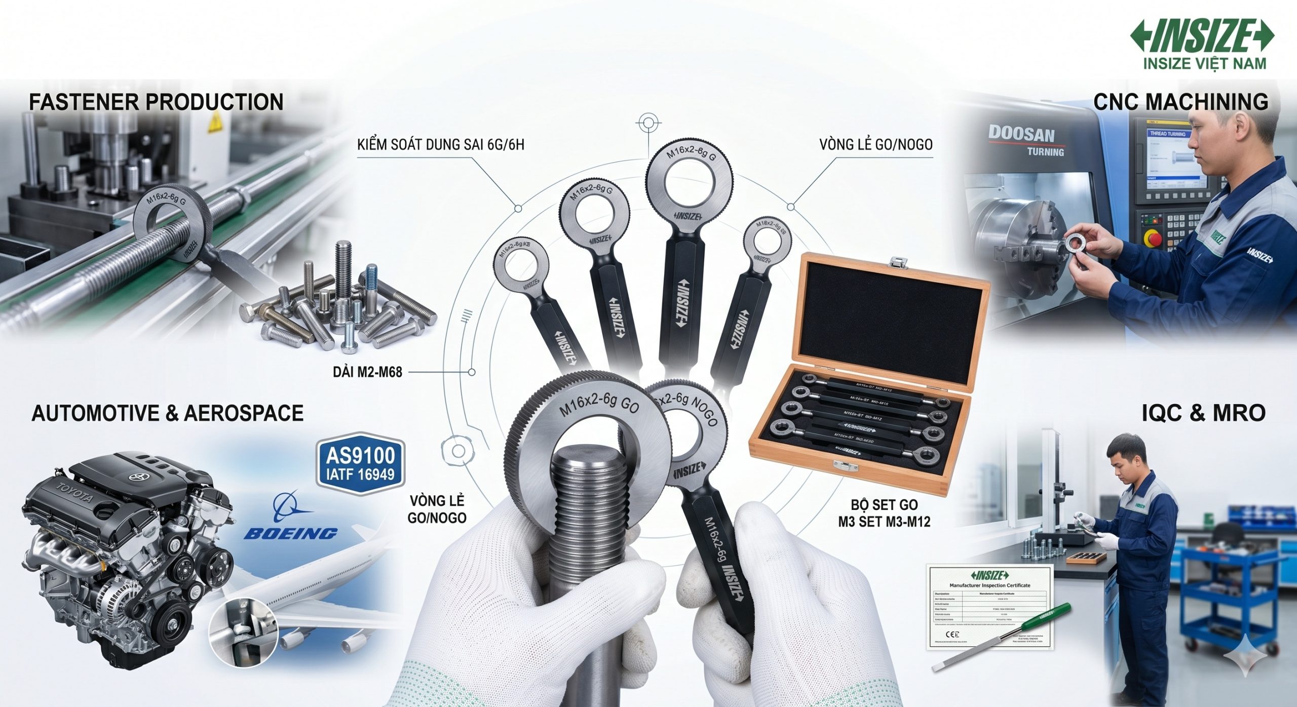 Điểm chạm kỹ thuật: Việc Insize cung cấp đa dạng các cấp chính xác gồm Class 6g, Class 6e và Class 6h cho phép kỹ sư xưởng linh hoạt kiểm soát các kiểu lắp ghép khác nhau. Ví dụ: Dùng Class 6g cho lắp ghép tiêu chuẩn, hoặc Class 6e cho các trục ren cần chừa lại dung sai để mạ kẽm/phủ bề mặt sau gia công.