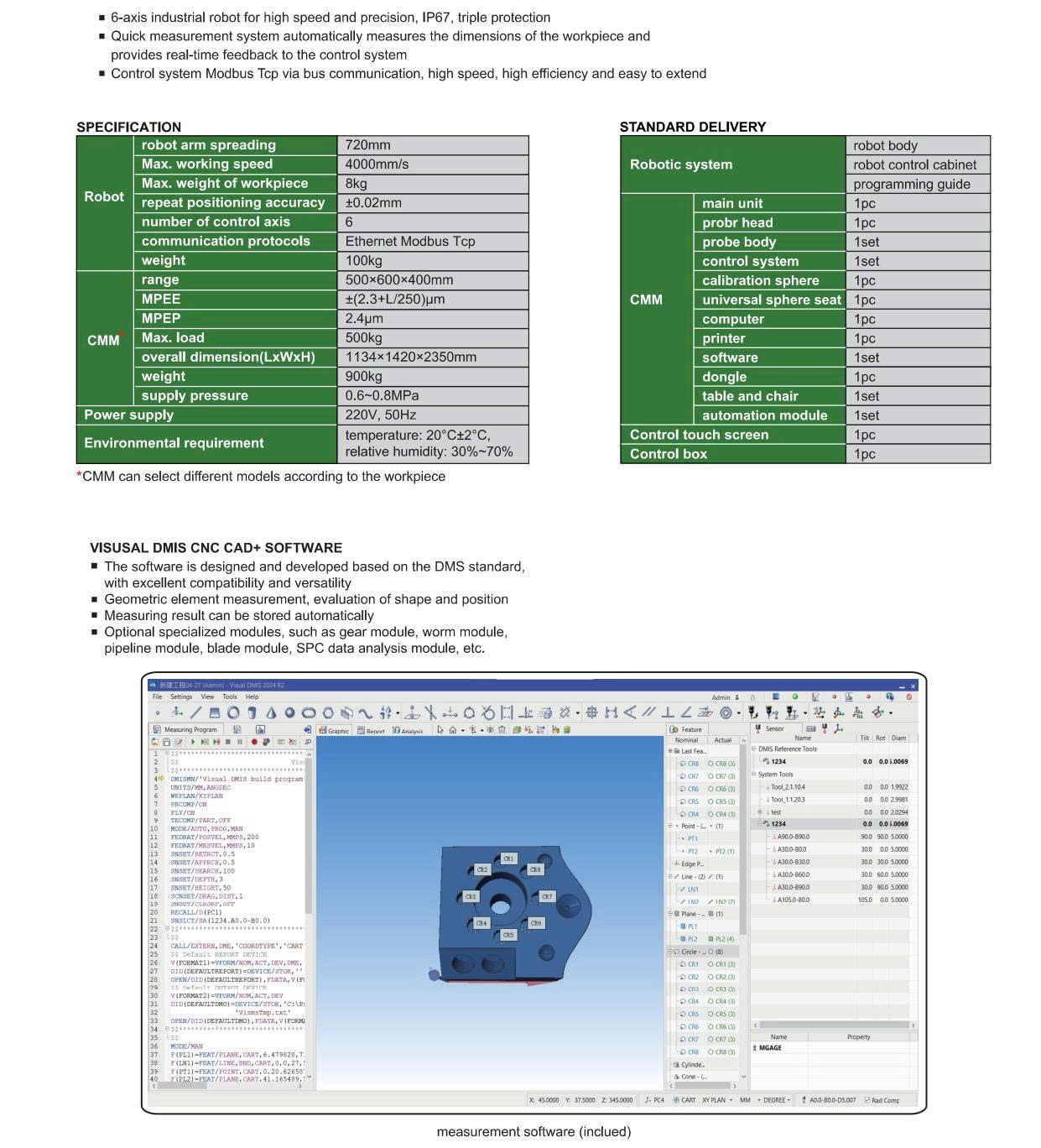 Trả lời: Hệ thống đo lường tự động này là sự tích hợp hoàn chỉnh của hai khối thiết bị công nghiệp mũi nhọn. Thứ nhất là máy đo tọa độ (CMM) có model tiêu chuẩn là CMM-LM554A. Thứ hai là cánh tay robot công nghiệp 6 trục làm nhiệm vụ bốc dỡ phôi tự động. Ngoài ra, tùy thuộc vào kích thước, trọng lượng và hình dáng của phôi thực tế, khách hàng có thể lựa chọn các model CMM khác nhau để đảm bảo sự tương thích tuyệt đối với dây chuyền. Hệ thống cũng đi kèm đồ gá tùy chỉnh (customised fixture), tủ điều khiển và phần mềm phân tích đồng bộ.