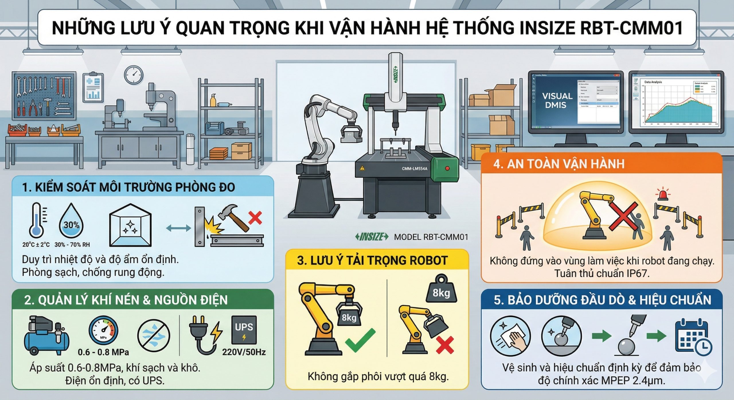 Hệ thống đo lường tự động Insize RBT-CMM01 là sự kết hợp của các thiết bị có độ chính xác cao. Để đảm bảo hệ thống hoạt động ổn định, duy trì độ bền và độ chuẩn xác (MPEP 2.4µm), người vận hành cần tuân thủ nghiêm ngặt các lưu ý sau: