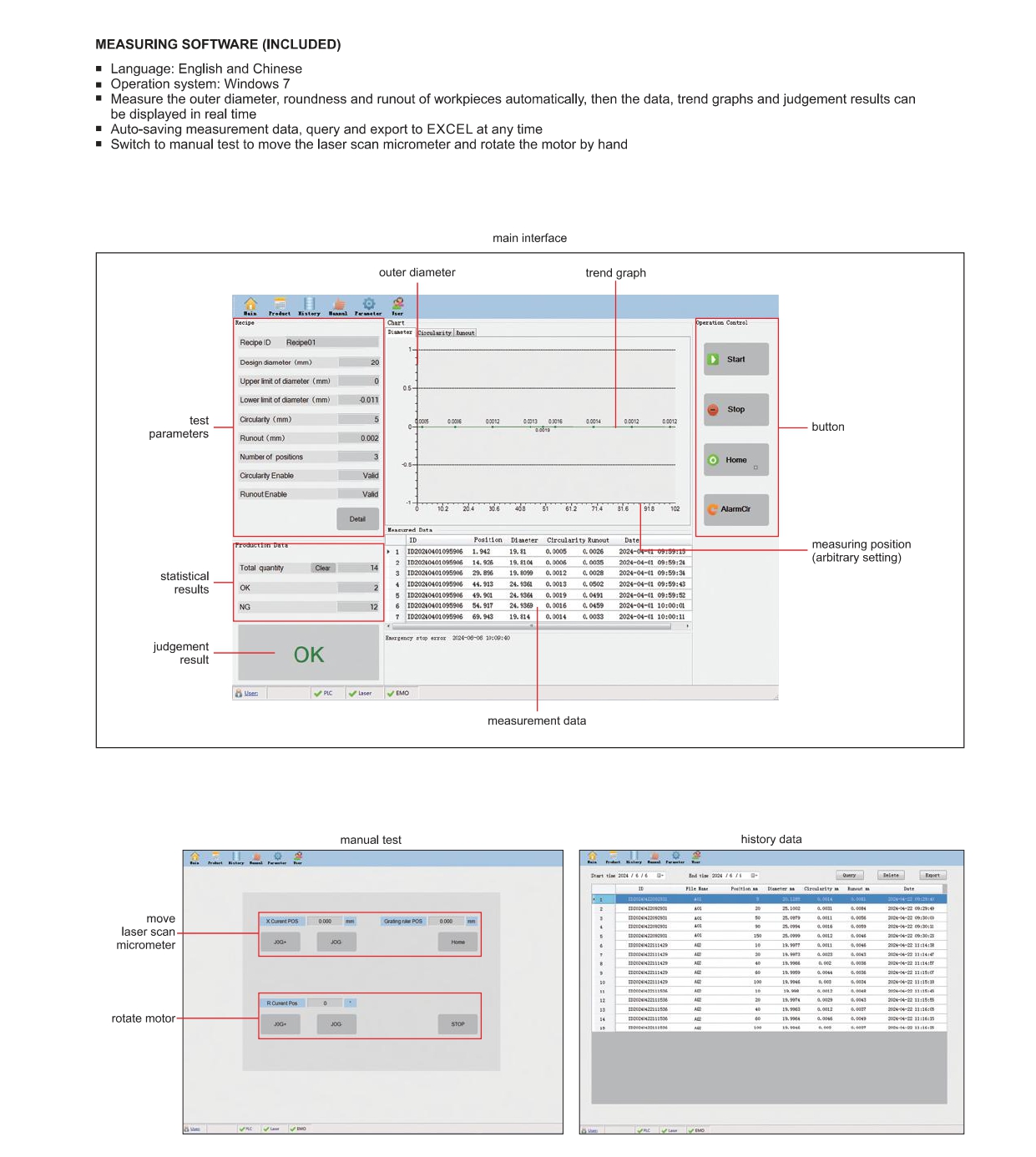 Trả lời: Máy được thiết kế đặc biệt để đo tự động ba thông số quan trọng nhất của các chi tiết hình trụ, bao gồm: đường kính ngoài (outer diameter), độ tròn (roundness) và độ đảo (runout) tại nhiều mặt cắt khác nhau.