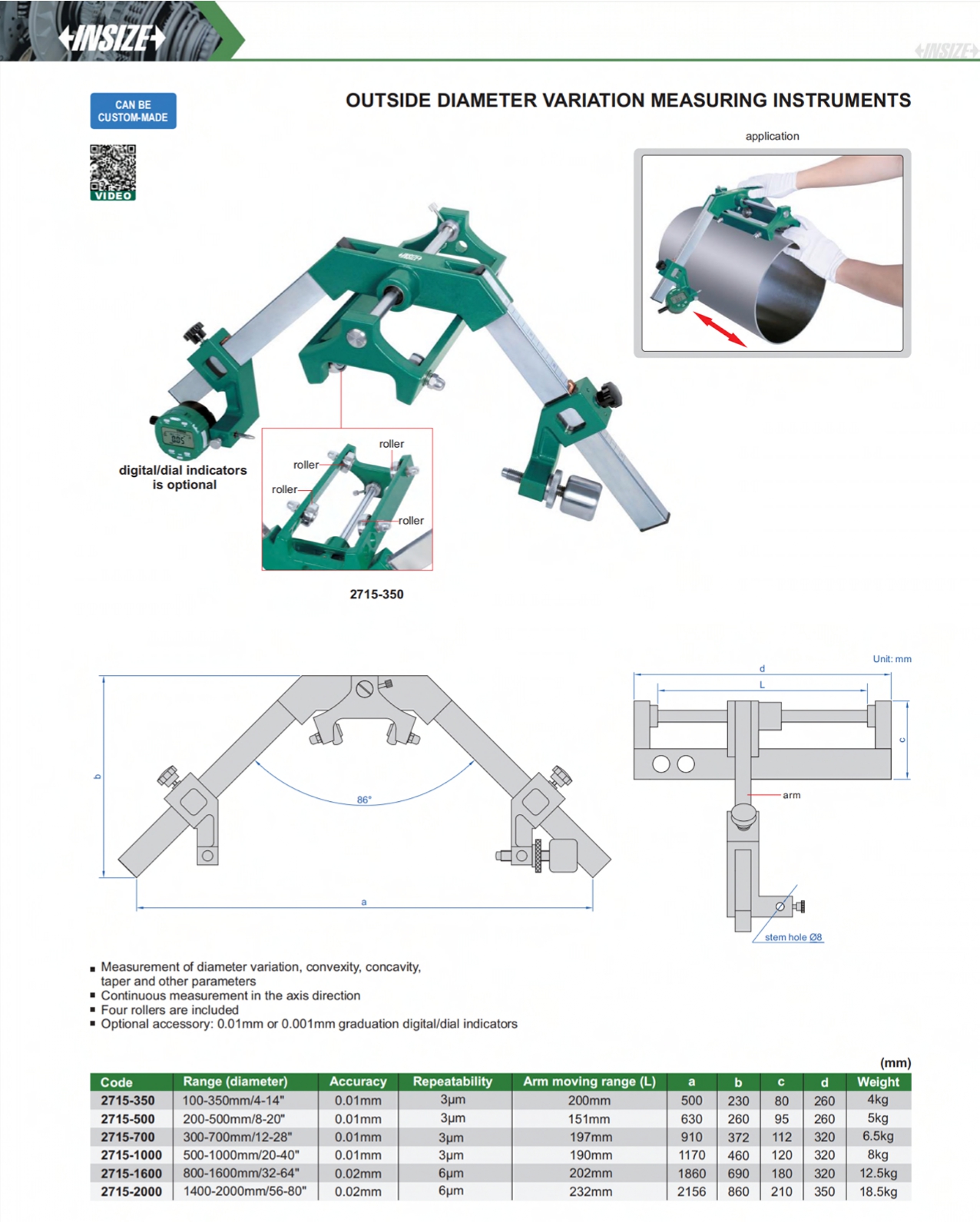 Insize 2715 là Thiết bị Đo Độ Biến Thiên Đường Kính Ngoài (Outside Diameter Variation) chuyên dụng, được thiết kế để kiểm tra độ chính xác hình học của các chi tiết trụ lớn (dải đo 100 mm – 2000 mm).