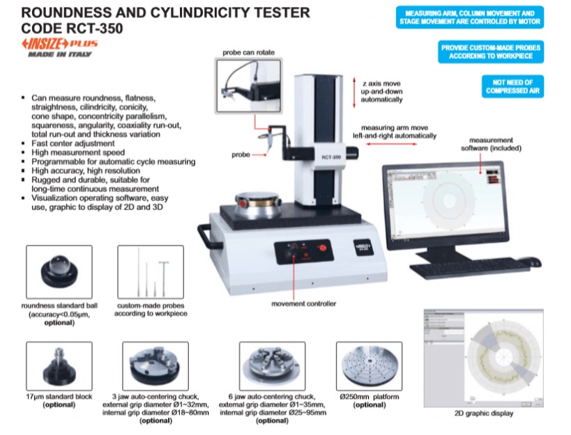 Máy đo độ tròn độ trụ tự động Insize RCT-350 là giải pháp kiểm soát chất lượng hình học đỉnh cao thuộc phân khúc INSIZE PLUS, được sản xuất và lắp ráp hoàn toàn tại Ý. Tạo ra một bước ngoặt trong ngành thiết bị đo lường chính xác, Insize RCT-350 vận hành hoàn toàn dựa trên hệ thống động cơ điều khiển đa trục mà không cần phụ thuộc vào nguồn khí nén phức tạp.