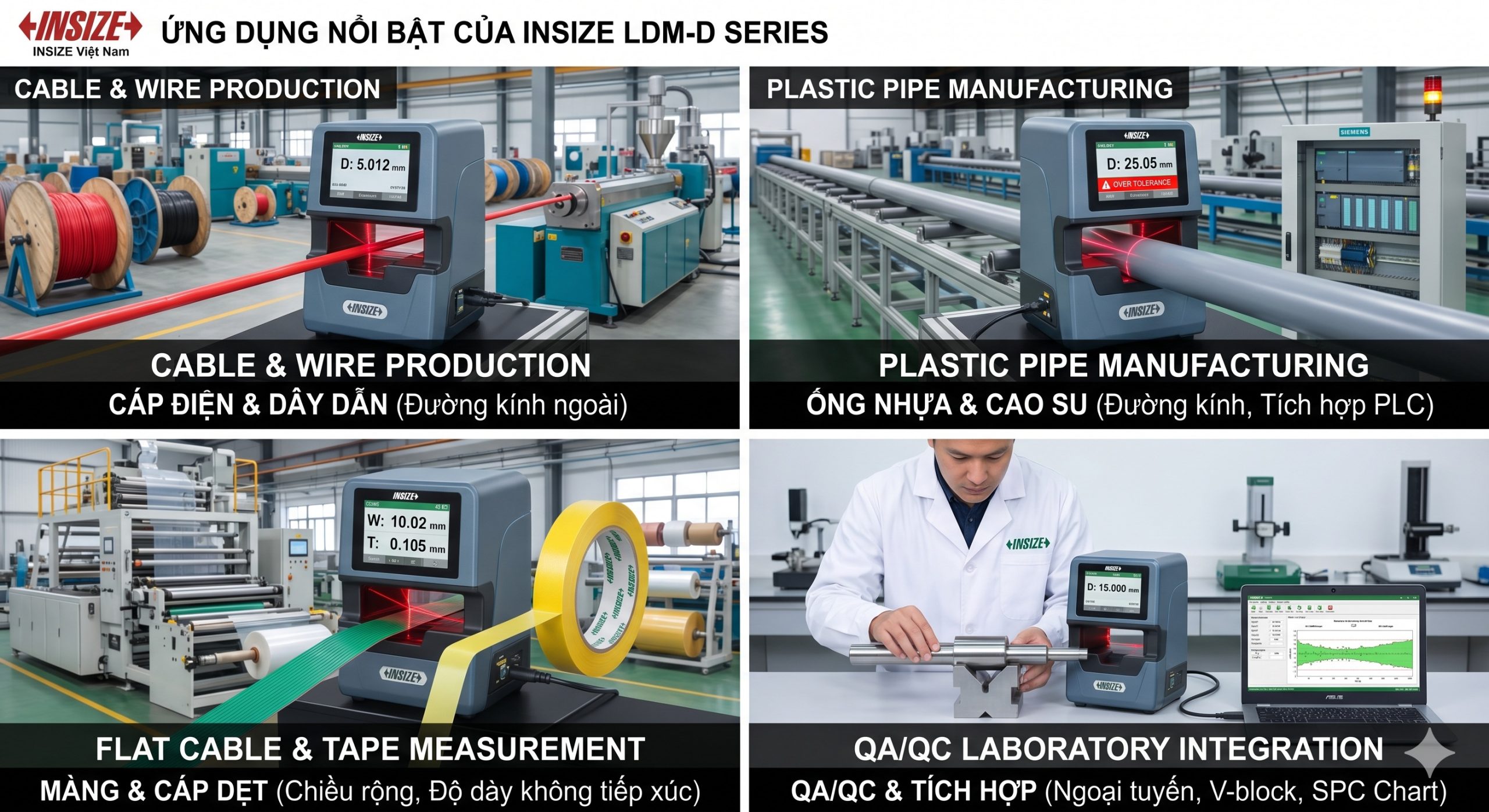 Là dòng thiết bị thuộc phân khúc loại cơ bản (Basic Type) nhưng sở hữu cấu hình quang học mạnh mẽ, máy đo vi phân Laser Insize LDM-D Series là khoản đầu tư thông minh cho các nhà máy cần số hóa quy trình kiểm soát chất lượng. Dưới đây là phân tích chi tiết về ứng dụng của thiết bị trong các ngành công nghiệp trọng điểm: