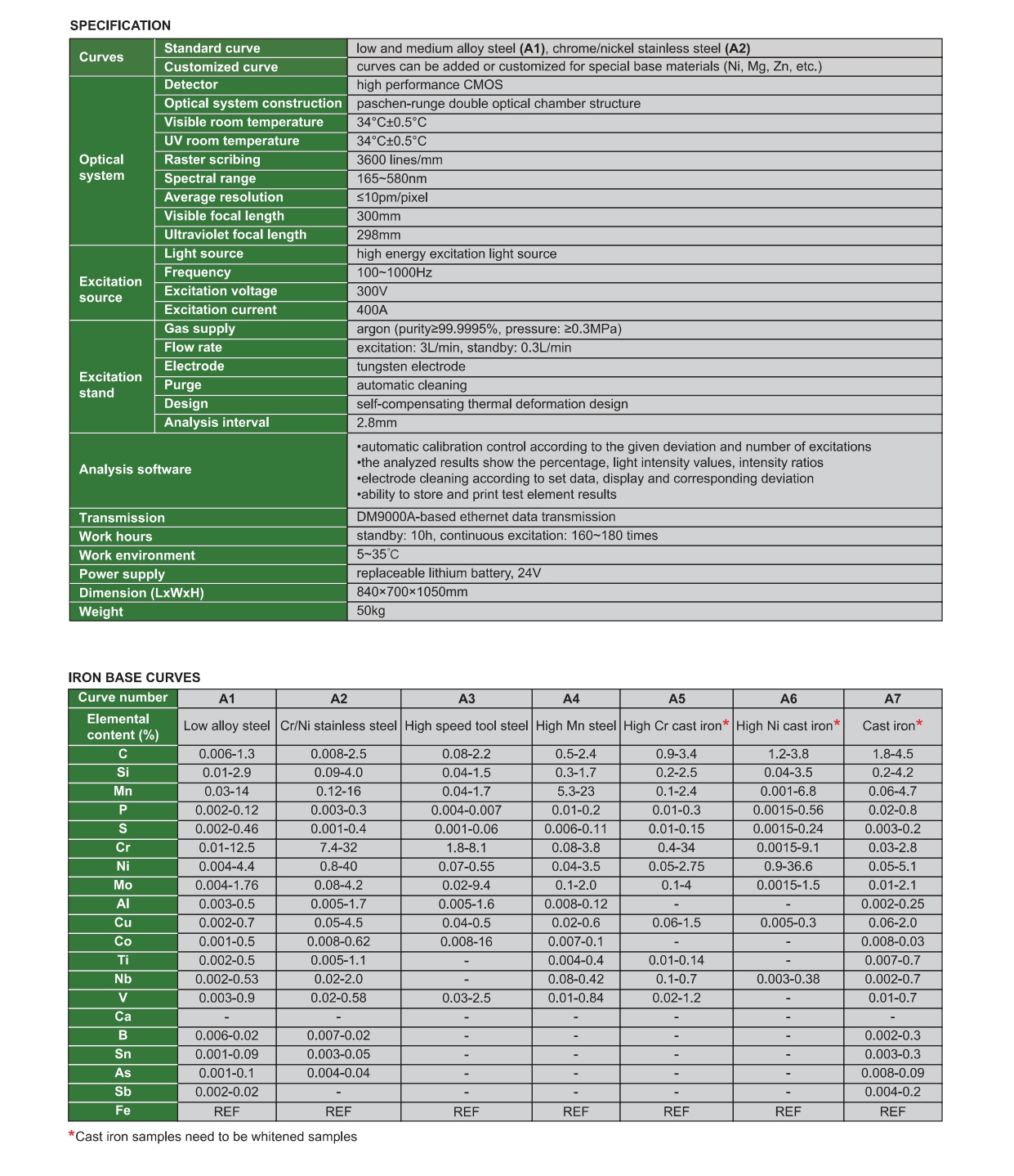 Bản tiêu chuẩn đo dải sóng 160-500nm (vật liệu buồng quang nhôm). Bản nâng cao đo dải rộng 130-800nm (vật liệu buồng quang gang), cho phép đo thêm các nguyên tố N, Li, Na, K.